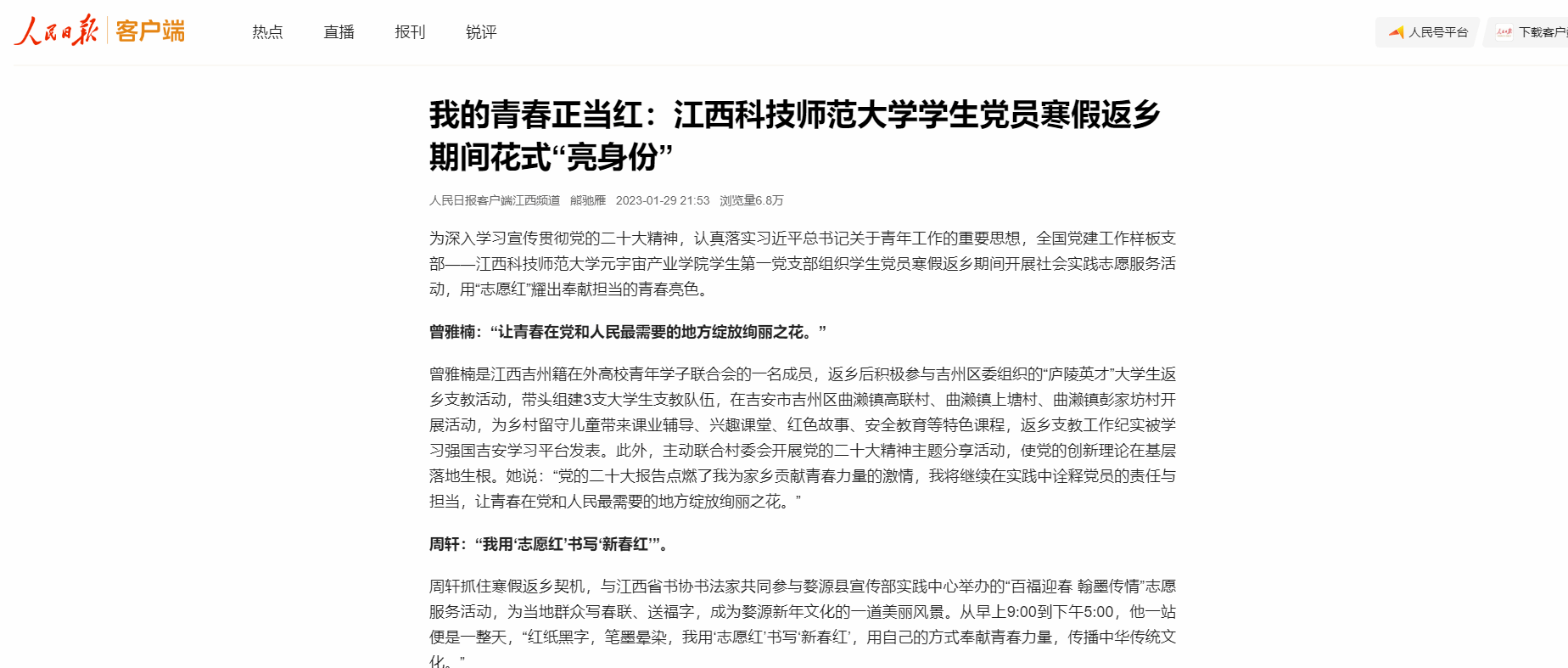 为深入学习宣传贯彻党的二十大精神,认真落实习近平总书记关于青年工作的重要思想,全国党建工作样板支部——江西科技师范大学元宇宙产业学院学生第一党支部组织学生党员寒假返乡期间开展社会实践志愿服务活动,用“志愿红”耀出奉献担当的青春亮色。