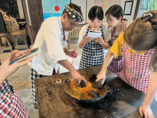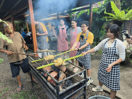 最具烟火气的环节莫过于传统烤鸡(Ayam Bakar)的制作。研学团分组协作,用石臼研磨香料、腌制鸡肉,在炭火的噼啪声中学习当地烹饪技艺。在品尝亲手制作的美食时,大家不仅感受到味蕾的满足,更体会到劳动实践带来的成就感。