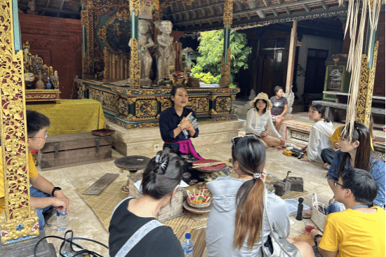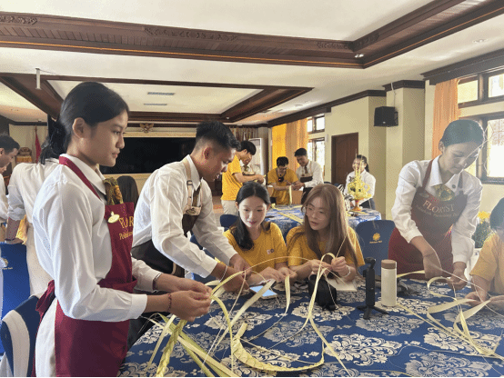 在印尼语言课堂上,经验丰富的Bubas老师通过情景模拟与互动问答形式,帮助研学成员迅速掌握日常用语,扫除沟通障碍。巴厘岛传统插花课程也同步展开,专业花艺师系统讲解了当地插花艺术的选材、构图与象征意义,印尼学生热情分享创作心得,并手把手指导研学成员完成花艺作品。在轻松愉悦的协作氛围中,每位成员都创作出独具个人风格的作品。