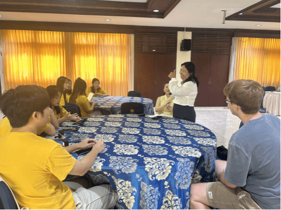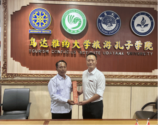 10月12日与14日,研学团先后走访了乌达雅纳大学旅游孔子学院与巴陵康孔子学院,了解了乌达雅纳大学开设的“旅游汉语”“酒店服务汉语”等特色课程以及巴陵康孔子学院在汉语教学与文化融合方面的创新实践。大家围绕“华裔身份认同”“非师范专业任教前景”等话题踊跃提问,拓宽了职业视野。座谈后,刘伟向院方赠送了我校王子文博士书法美育名师工作室的书法作品,表达友好情谊。